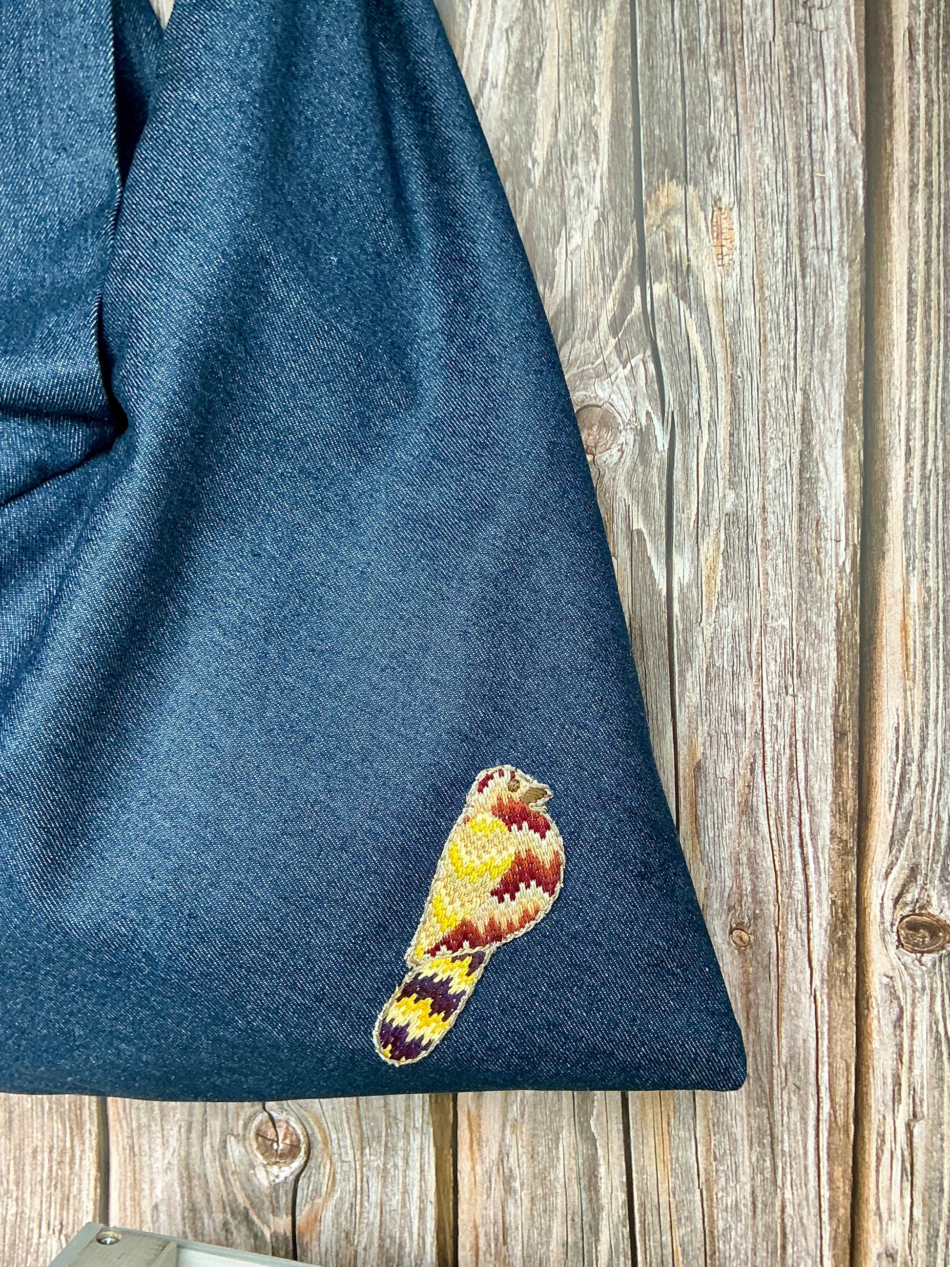 Large handmade denim bag embellished with Bargello embroidery of a bird. Magnetic fastener.